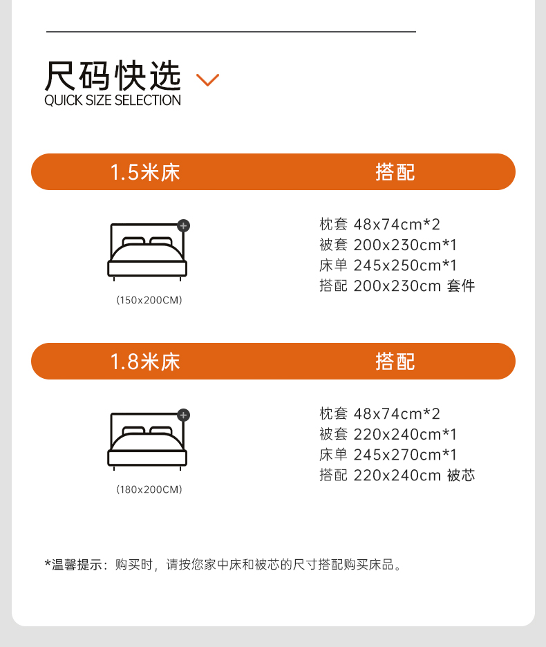 适用1.2米床,建议搭配160*210cm被芯 适用1.5米床,建议搭配200*230cm被芯 适用1.8米床,建议搭配220*240cm被芯